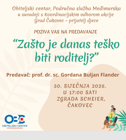 Obiteljski centar, Područna služba Međimurska, u suradnji s Gradom Čakovcem u okviru programa Grad Čakovec – prijatelj djece poziva roditelje na predavanje naslovljeno „Zašto je danas teško biti roditelj?“. Predavanje će se održati 30. siječnja 2026. godine u Zgradi Scheier u Čakovcu, a vodit će ga prof. dr. sc. Gordana Buljan Flander. Pozivamo sve zainteresirane roditelje!